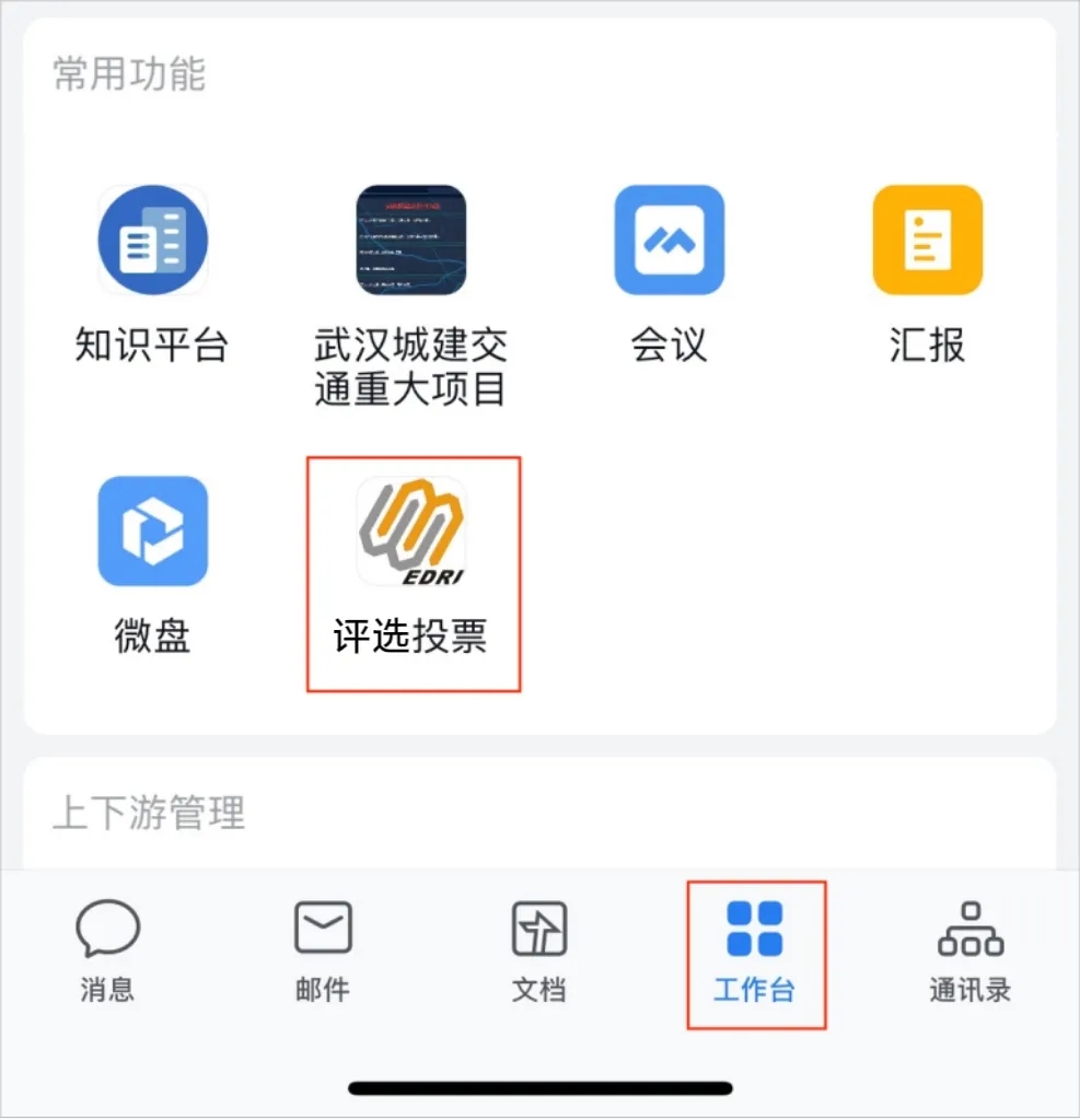 手機(jī)端企業(yè)微信進(jìn)入工作臺(tái),在常用功能一欄中打開“評(píng)選投票”小程序。
