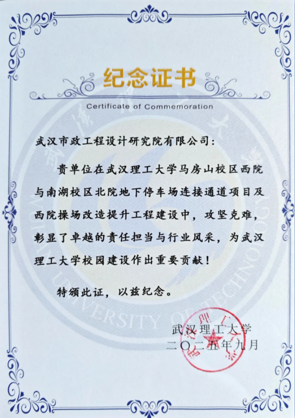 2025年9月6日上午,由武漢市政院設(shè)計的武漢理工大學(xué)馬房山校區(qū)西院與南湖校區(qū)北院地下停車場連接通道項目(以下簡稱“武漢理工大學(xué)地下通道”)通車儀式隆重舉行。洪山區(qū)區(qū)委區(qū)政府主要領(lǐng)導(dǎo)、武漢理工大學(xué)領(lǐng)導(dǎo)及各參建單位代表共同出席,見證這一重要時刻。儀式上,洪山區(qū)區(qū)委主要領(lǐng)導(dǎo)頒發(fā)“紀(jì)念證書”,表彰武漢市政院等參建單位在項目設(shè)計與實施過程中作出的重要貢獻(xiàn)。