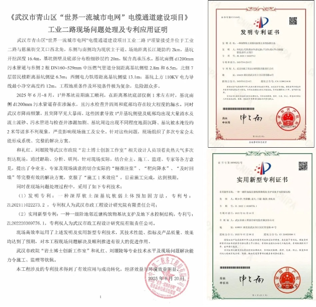 發(fā)明專(zhuān)利“一種深厚軟土深基坑軟弱土體預(yù)加固方法”(專(zhuān)利號(hào):ZL202111022273.2)與實(shí)用新型專(zhuān)利“一種一級(jí)階地鄰近建構(gòu)筑物基坑支護(hù)及地下水控制結(jié)構(gòu)”(專(zhuān)利號(hào):ZL202220309776.1),在武漢市青山區(qū)“世界一流城市電網(wǎng)”電纜通道建設(shè)項(xiàng)目——工業(yè)二路現(xiàn)場(chǎng)問(wèn)題處理中實(shí)現(xiàn)了高效應(yīng)用。兩項(xiàng)專(zhuān)利的技術(shù)性能、實(shí)施效果及產(chǎn)品質(zhì)量均達(dá)到預(yù)期目標(biāo),成功完成了技術(shù)轉(zhuǎn)化,展現(xiàn)出良好的經(jīng)濟(jì)效益與環(huán)境效益。