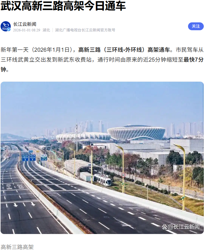 2026年1月1日,由武漢市政院參與設(shè)計(jì)的高新三路(三環(huán)線(xiàn)~外環(huán)線(xiàn))改造提升工程主線(xiàn)高架通車(chē)!這條西起三環(huán)線(xiàn)武黃立交、東至新武東收費(fèi)站,總長(zhǎng)10.7公里(其中主線(xiàn)高架8.23公里)的交通大動(dòng)脈,以“主線(xiàn)高架+地面輔道”的立體格局,打通了光谷東向通行瓶頸,也承載著武漢市政院在綠色建造領(lǐng)域的技術(shù)突破,為武漢智慧交通建設(shè)樹(shù)立了新標(biāo)桿。