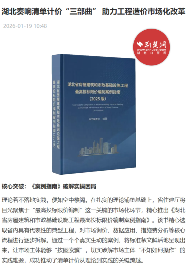 隨著《湖北省建設(shè)工程工程量清單計(jì)價(jià)指引(2026)》《湖北省園林綠化工程投資估算指標(biāo)(試行)》《湖北省房屋建筑和市政基礎(chǔ)設(shè)施工程最高投標(biāo)限價(jià)編制案例指南》以及《建設(shè)工程工程量清單計(jì)價(jià)(GB/T 50500—2024)及計(jì)算標(biāo)準(zhǔn)應(yīng)用與實(shí)務(wù)》等一系列規(guī)范與專著的陸續(xù)發(fā)布,湖北省圍繞國(guó)家標(biāo)準(zhǔn)《建設(shè)工程工程量清單計(jì)價(jià)標(biāo)準(zhǔn)》(GB/T 50500—2024)構(gòu)建的“理論解析—實(shí)操示范—規(guī)則指引”三位一體清單計(jì)價(jià)體系已正式形成,標(biāo)志著湖北省工程造價(jià)行業(yè)邁入市場(chǎng)化、規(guī)范化發(fā)展的新階段。近日,荊楚網(wǎng)與湖北日?qǐng)?bào)網(wǎng)專題刊登了題為《湖北奏響清單計(jì)價(jià)“三部曲”助力工程造價(jià)市場(chǎng)化改革》的報(bào)道。