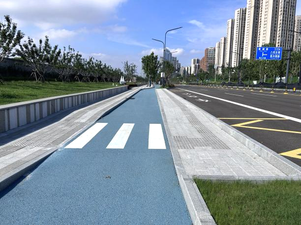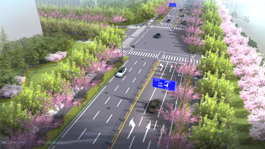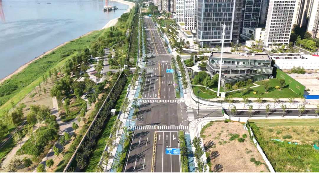 本項(xiàng)目北起江安路,南至八坦路,全長(zhǎng)約2.58公里,規(guī)劃為城市主干路。道路紅線寬40米,采用雙向6車道設(shè)計(jì),并實(shí)現(xiàn)了人行道、非機(jī)動(dòng)車道與機(jī)動(dòng)車道的完全分離,充分保障了所有交通參與者的安全與路權(quán)。本次通車范圍江盛西路~八坦路段長(zhǎng)約1.8公里,該段道路的通車,極大改善了周邊數(shù)萬(wàn)居民的出行條件,有效緩解了區(qū)域交通壓力。尤為重要的是,本道路成功承擔(dān)起“縫合紐帶”的功能,將沿線城市地塊與長(zhǎng)江江灘公園有機(jī)銜接,并與濱江綠化景觀帶相互融合,共同構(gòu)建出連續(xù)、舒適、優(yōu)美的綠道及景觀系統(tǒng),為廣大市民和游客提供了更優(yōu)質(zhì)的漫步、騎行與游覽體驗(yàn),切實(shí)提升了濱江區(qū)域的公共空間品質(zhì)。