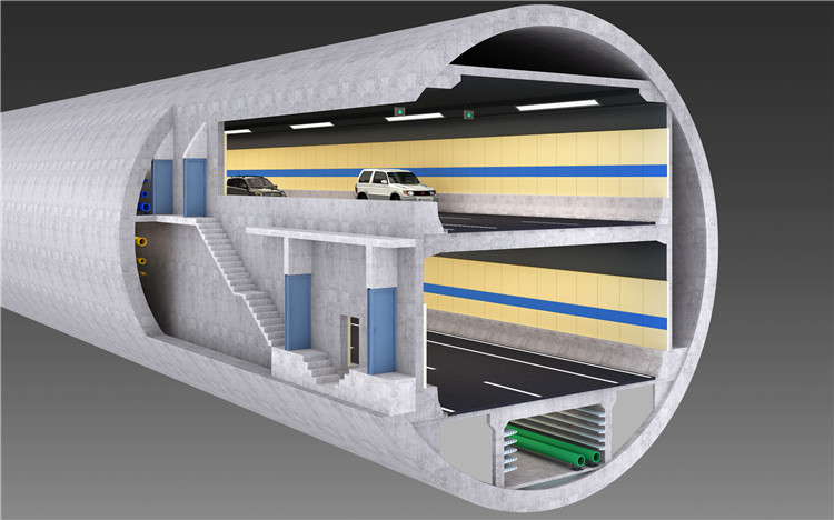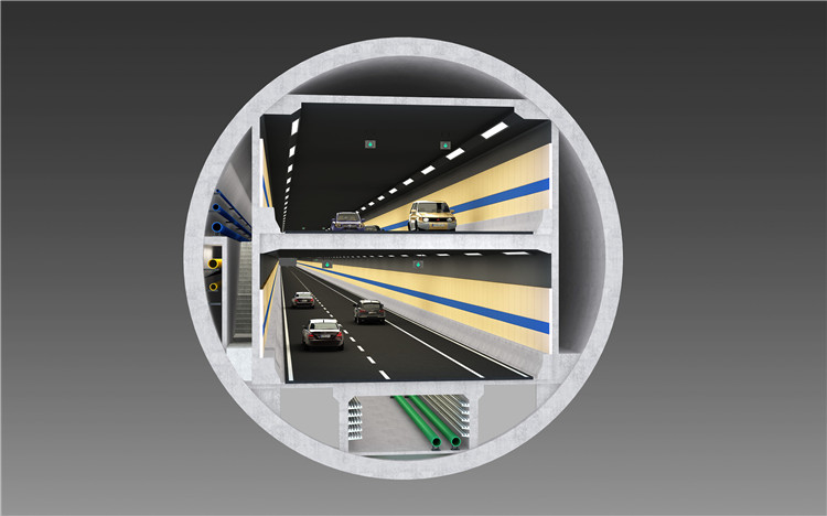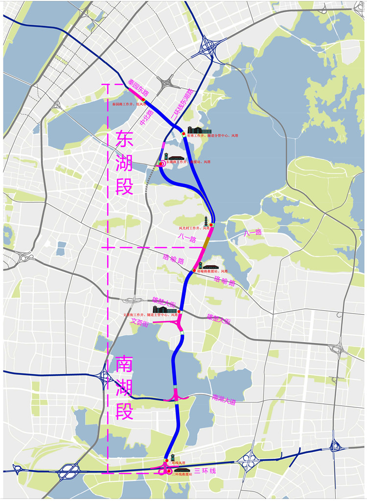 兩湖隧道工程北接秦園路和東湖路,南連三環(huán)線,分為東湖段、南湖段,全長(zhǎng)約19公里。兩湖隧道采用“隧-路-隧”的總體建設(shè)方式,隧道內(nèi)設(shè)計(jì)為上、下兩層,分別行駛不同方向的車(chē)輛,節(jié)約了用地、減少拆遷成本。南湖段盾構(gòu)直徑為15.5米,超大直徑設(shè)計(jì)居國(guó)內(nèi)之首,是國(guó)內(nèi)最長(zhǎng)、世界規(guī)模最大的城市湖底雙層隧道。