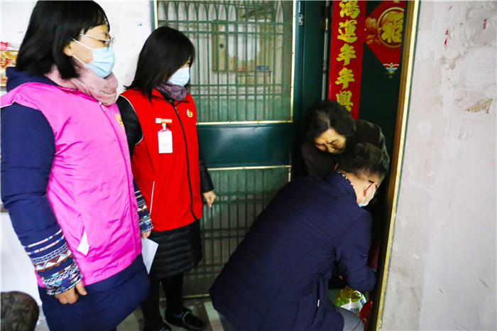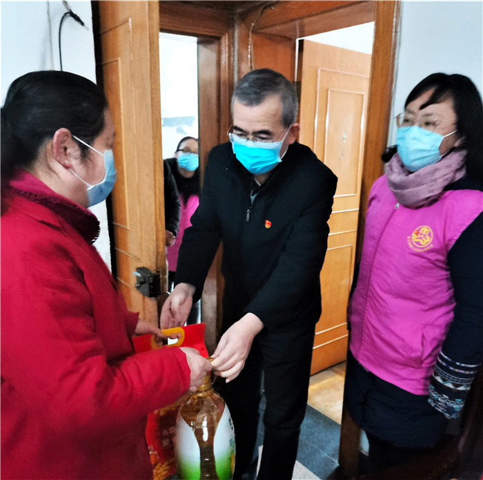 慰問期間,恰逢社區(qū)正在開展“臘八送福·甜蜜相伴”活動,談逢陽一行也加入其中,熱情地為前來的社區(qū)居民發(fā)放臘八米,送上殷切的節(jié)日祝福,叮囑他們要做好防護。