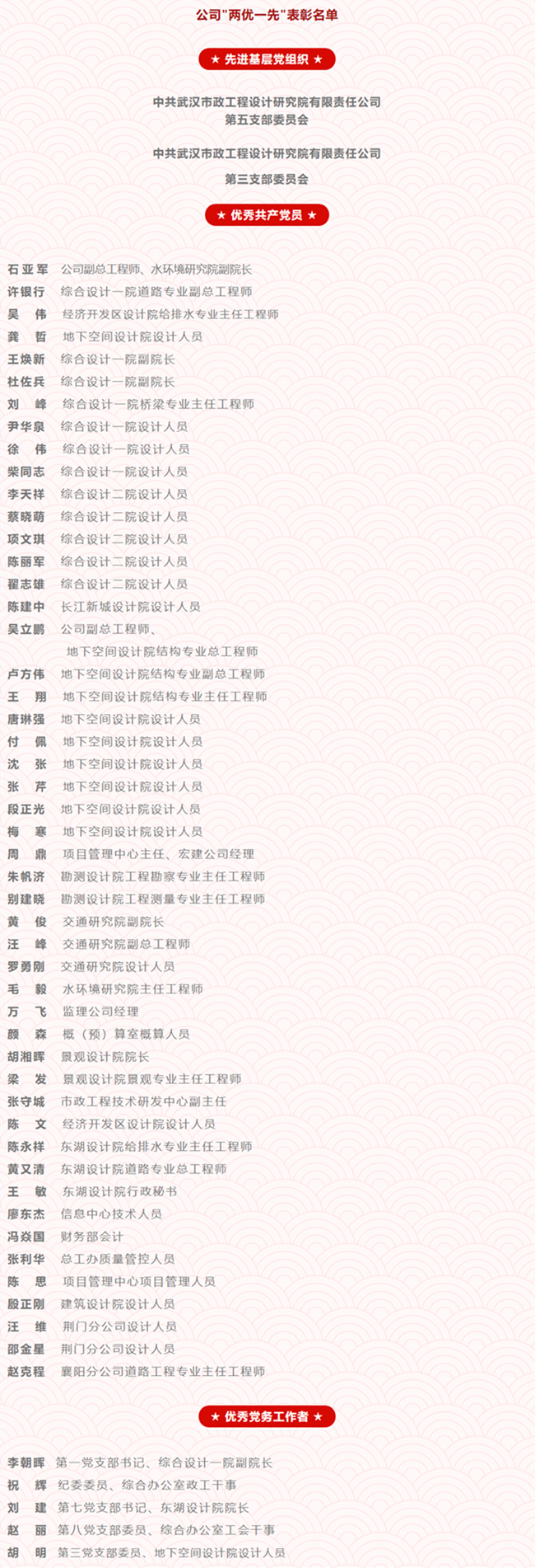 中共武漢市政工程設(shè)計(jì)研究院有限責(zé)任公司第五支部委員會(huì)榮獲市城投集團(tuán)公司“先進(jìn)基層黨組織”稱號(hào)。