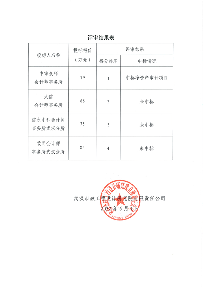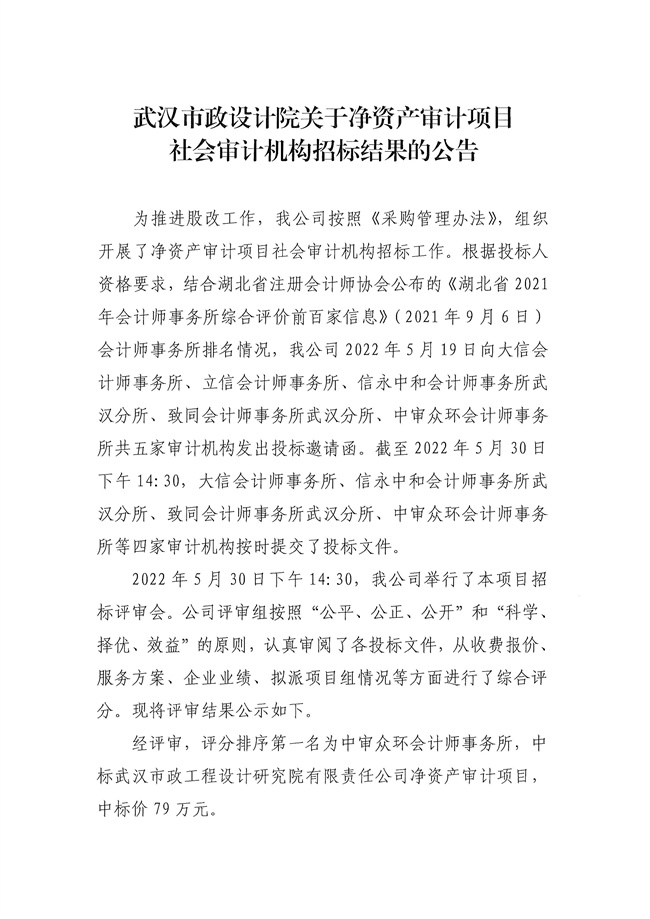 武漢市政設(shè)計(jì)院關(guān)于凈資產(chǎn)審計(jì)項(xiàng)目社會審計(jì)機(jī)構(gòu)招標(biāo)結(jié)果的公告