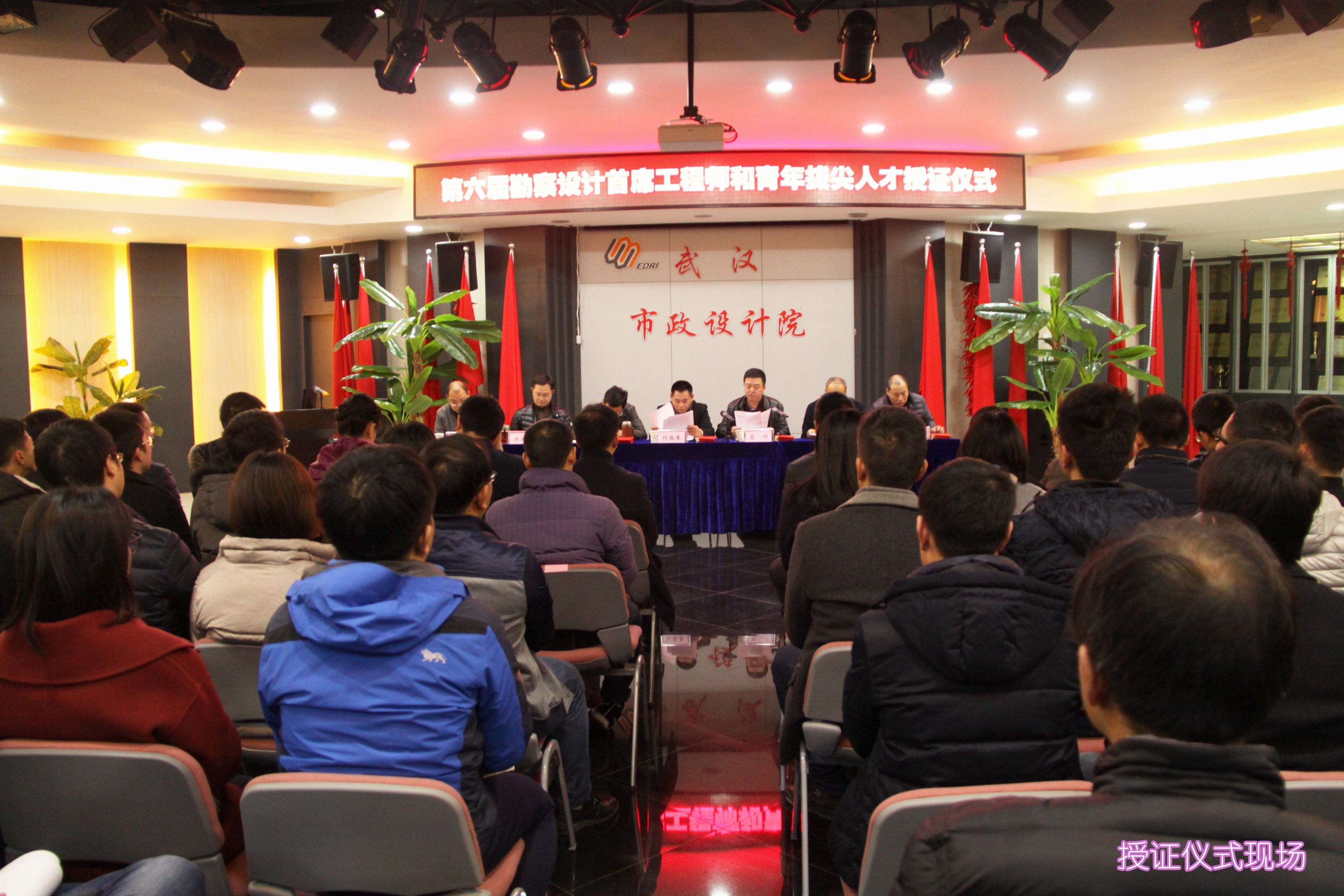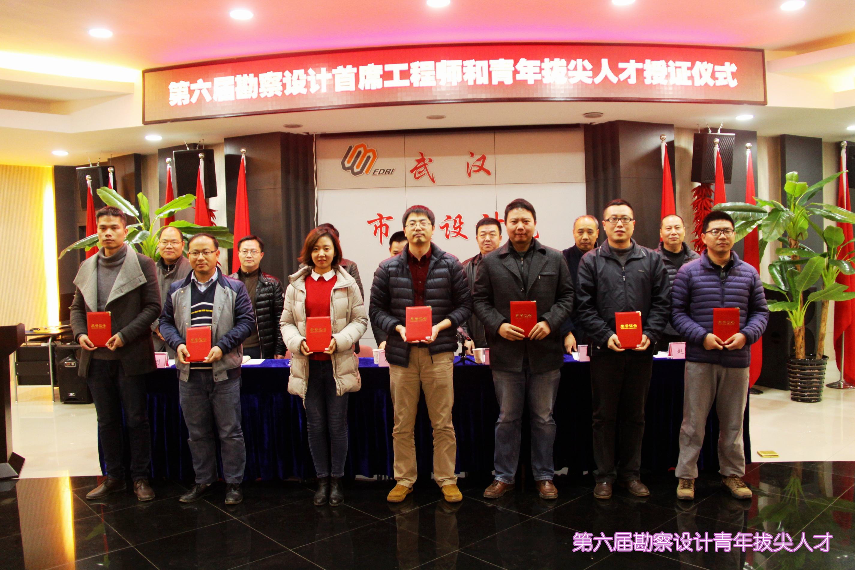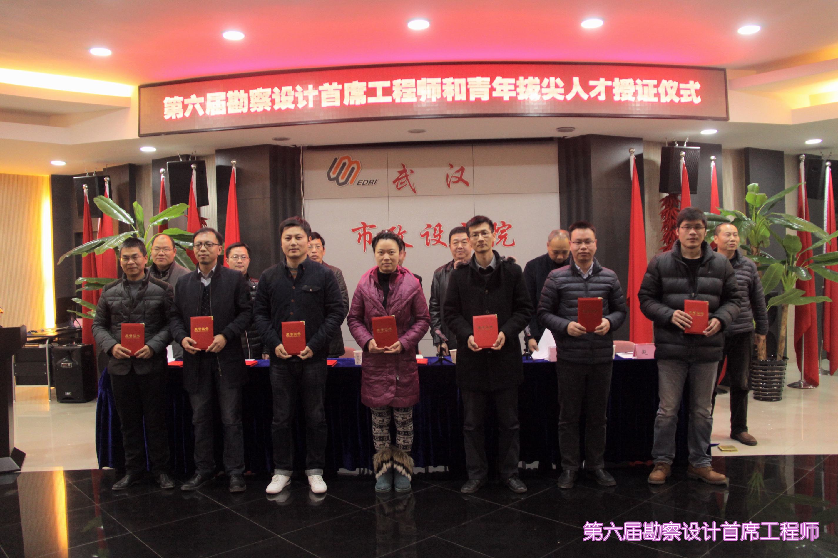 ??? 授證儀式由副總經理、總工程師蔣樂同志主持,黨委書記蔡輝同志宣讀了授予“第六屆勘察設計首席工程師、青年拔尖人才”榮譽稱號的決定,隨后,他們順次走到主席臺前,從公司領導手中接過了榮譽證書,會場上響起熱烈掌聲,向他們表示祝賀。