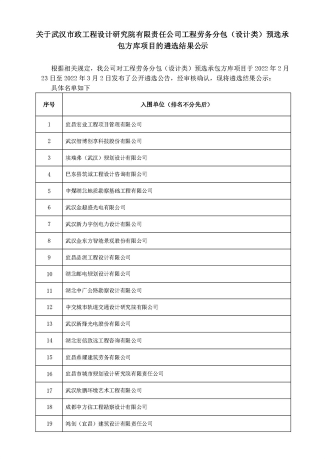 關(guān)于武漢市政工程設(shè)計研究院有限責(zé)任公司工程勞務(wù)分包(設(shè)計類)預(yù)選承包方庫項目的遴選結(jié)果公示