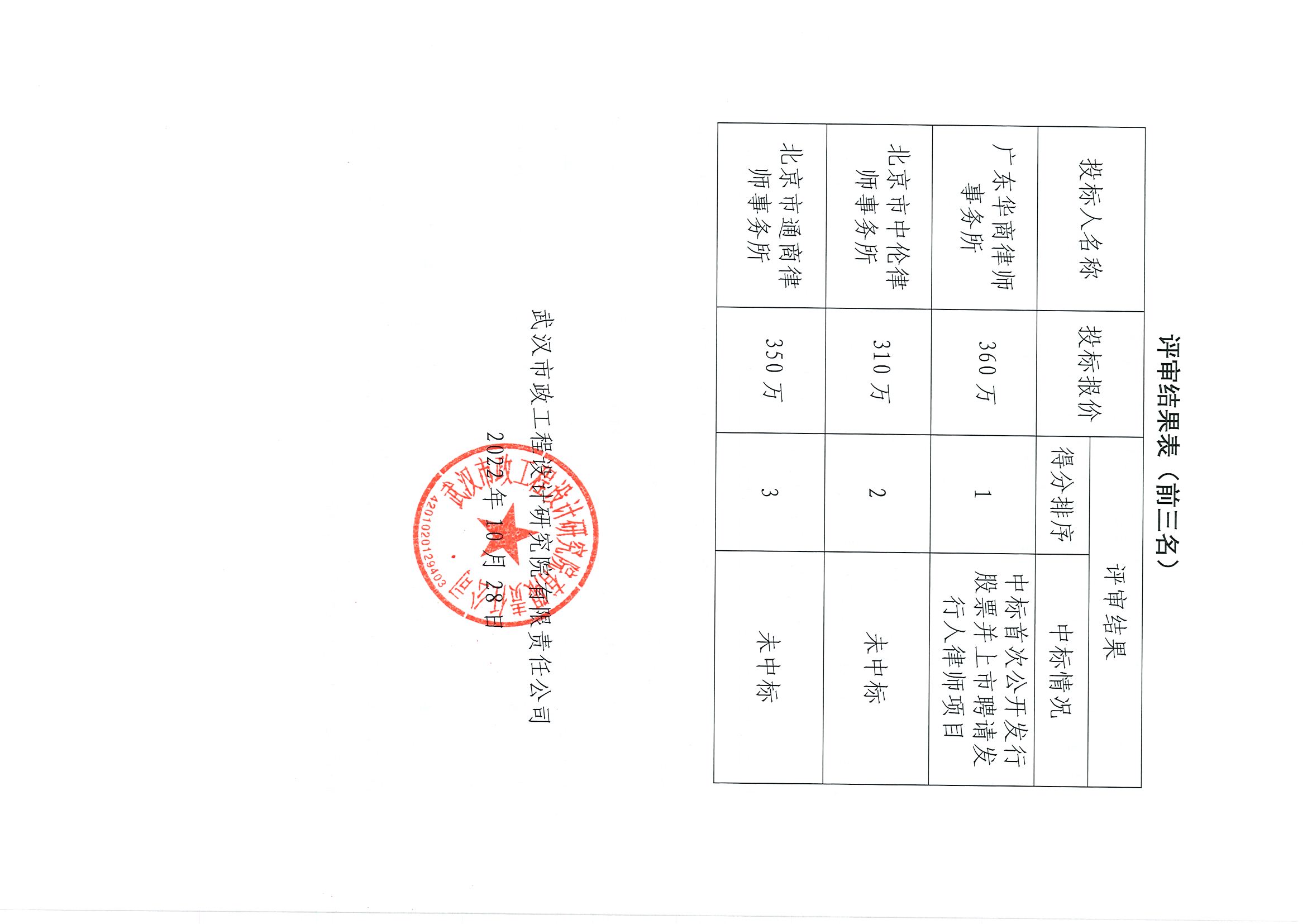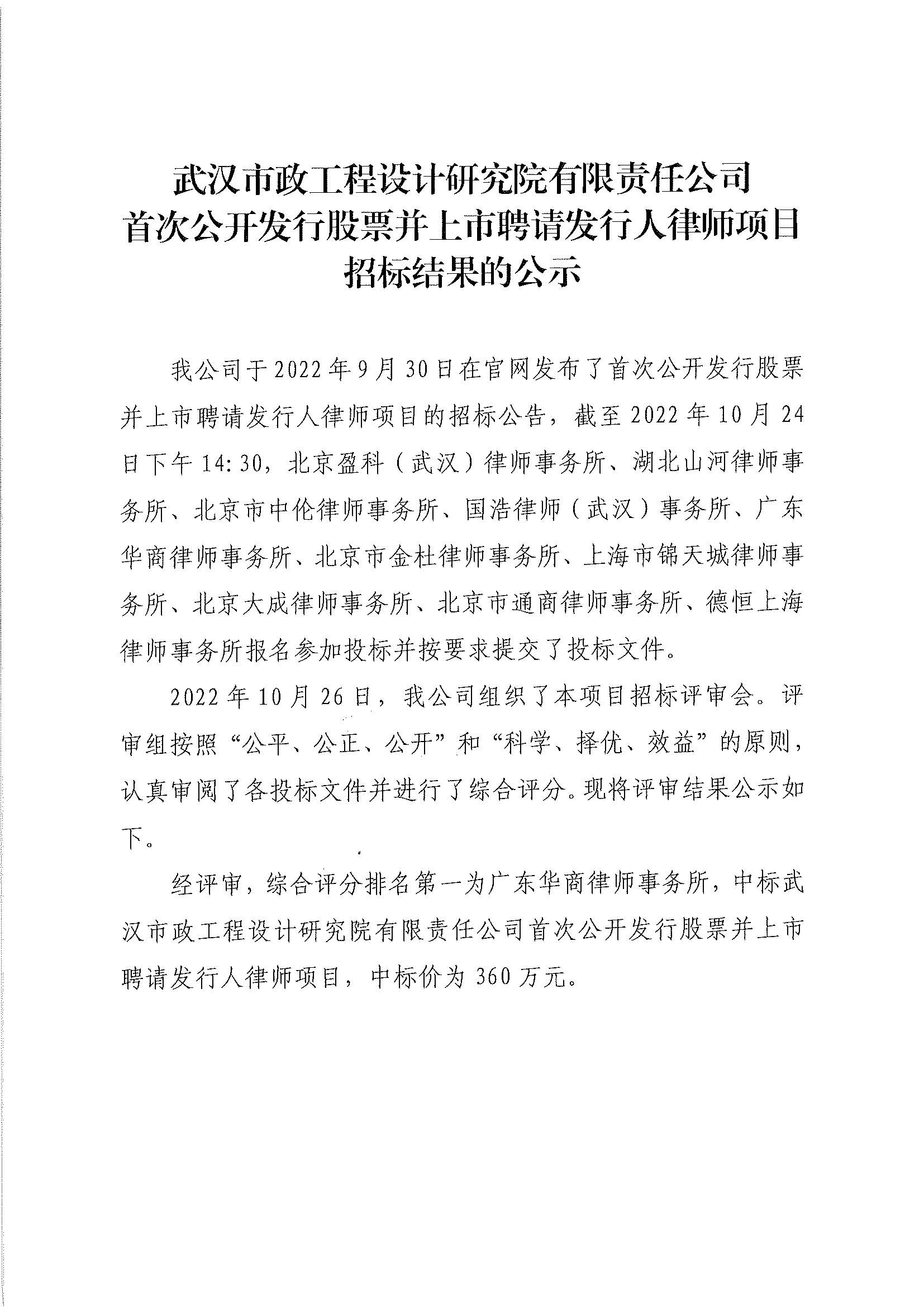 武漢市政工程設(shè)計研究院有限責(zé)任公司首次公開發(fā)行股票并上市聘請發(fā)行人律師項目招標(biāo)結(jié)果的公示