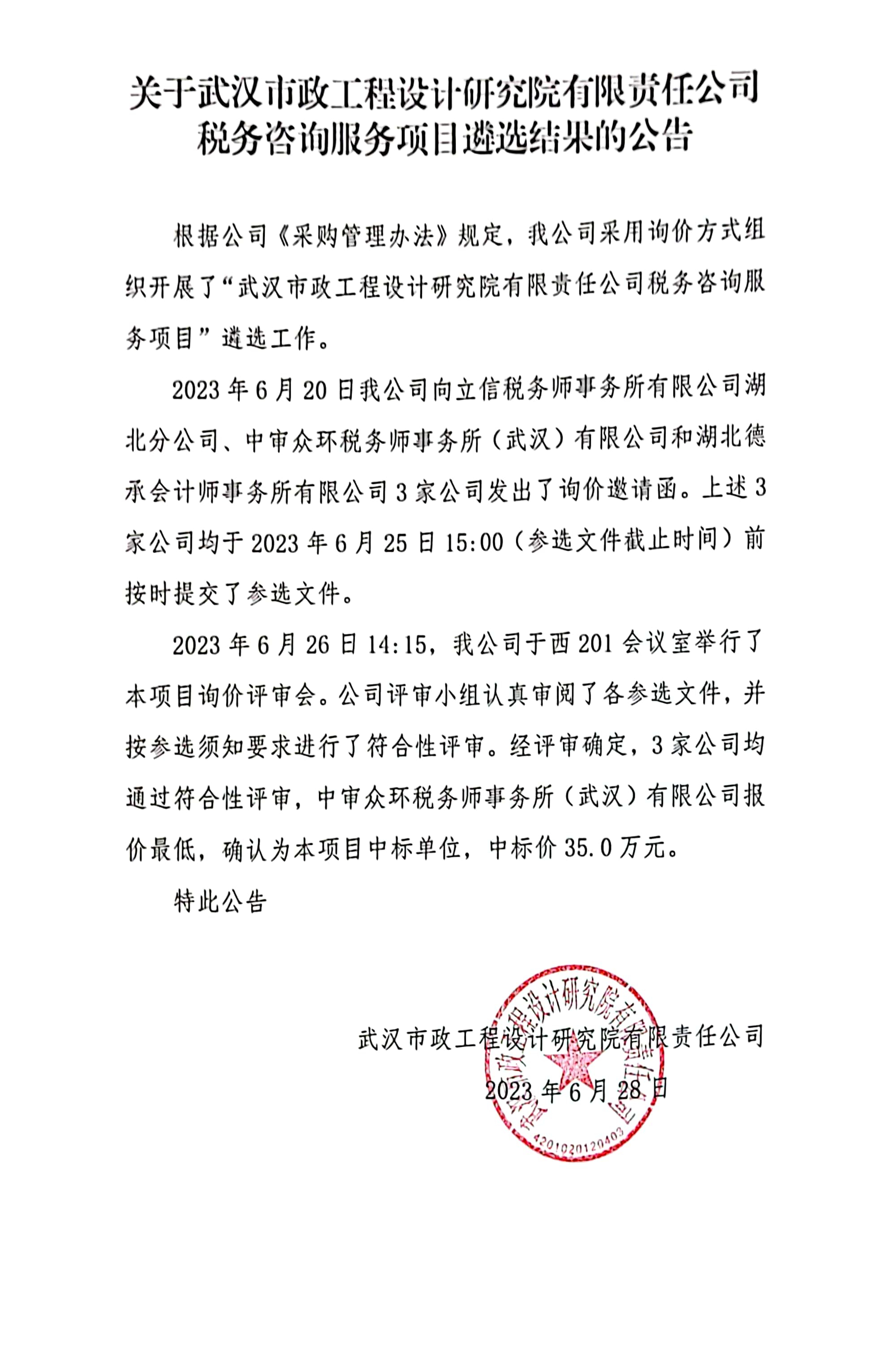 關(guān)于武漢市政工程設(shè)計(jì)研究院有限責(zé)任公司稅務(wù)咨詢(xún)服務(wù)項(xiàng)目遴選結(jié)果的公告